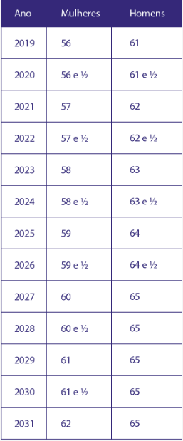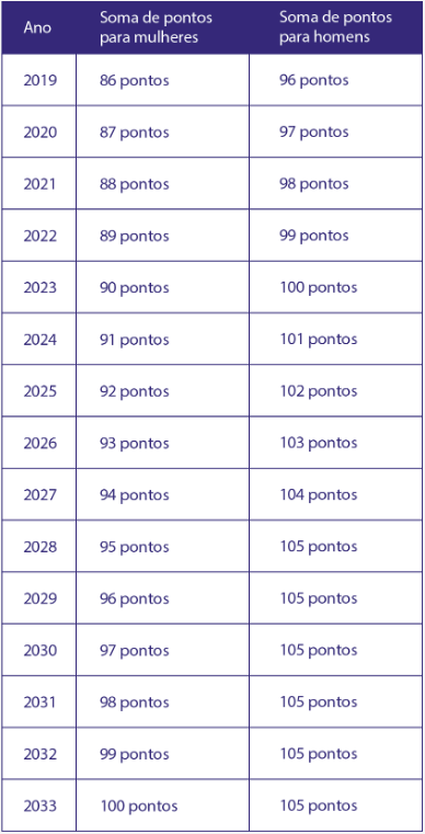 Neste caso não importa a pontuação, mas sim a idade, que inicia em 56 anos para a mulher e 61 anos para o homem e aumenta seis meses até igualar a regra permanente de 62 e 65 anos.
