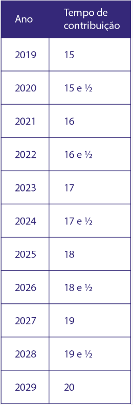 Após a contagem inicial, é preciso verificar o total do tempo de contribuição, de acordo com a seguinte tabela, vamos lembrar como são as regras atuais primeiro e como vão ficar as regras no futuro: