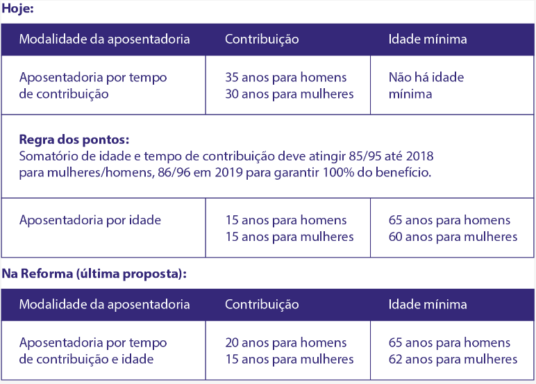 A aposentadoria por idade, agora unificada com a aposentadoria por tempo de contribuição, seguirá a regra mínima de contribuição de 20 anos, combinado com a idade, de 62 para mulheres e 65 para homens.