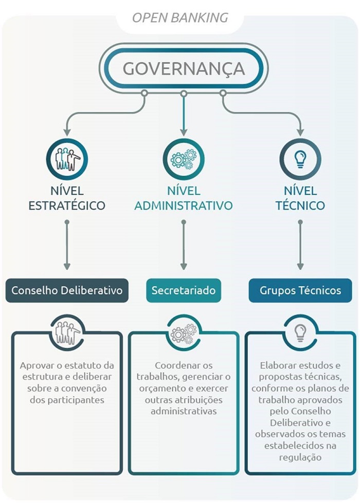 A estrutura inicial de governança do Open Banking será dividida em três níveis: estratégico, administrativo e técnico. As funções do nível estratégico serão desempenhadas pelo Conselho Deliberativo, componente formado por um conselheiro independente e seis conselheiros indicados por associações ou grupos de associações com representatividade significativa entre as instituições que prestam os serviços do escopo inicial do Open Banking (operações de crédito de varejo, contas de depósitos e serviços de pagamento). Suas principais funções são definir o regimento interno da estrutura de governança, deliberar sobre a convenção das instituições participantes, definir diretrizes para o Secretariado e para os Grupos Técnicos e decidir sobre as demais questões necessárias à implementação do Open Banking.