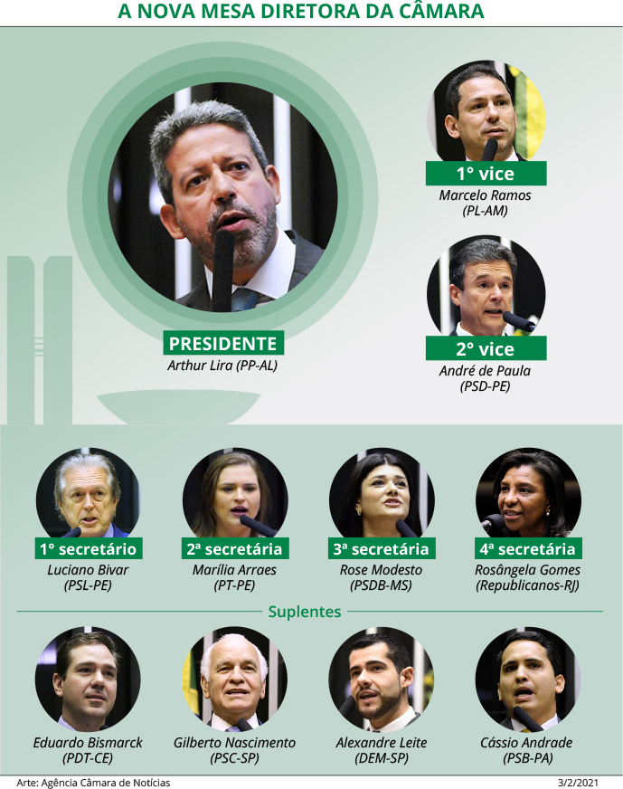 A Câmara dos Deputados elegeu, nesta quarta-feira (3), os integrantes da Mesa Diretora que vai conduzir as atividades da Casa nos próximos dois anos. Foram escolhidos dois vice-presidentes, quatro secretários e quatro suplentes. O novo presidente, deputado Arthur Lira (PP-AL), já havia sido eleito na segunda-feira (1º).
