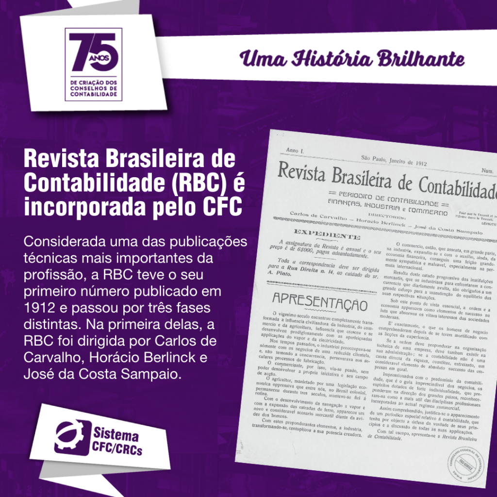 Considerada uma das publicações técnicas mais importantes da profissão, a Revista Brasileira de Contabilidade (RBC) teve o seu primeiro número editado em 1912, mas passou por três fases distintas. Na primeira delas, a RBC foi dirigida por Carlos de Carvalho, Horácio Berlinck e José da Costa Sampaio e administrada por Francisco D´Áuria, Carlos Levy Magano, Raymundo Marchi e Emílio de Figueiredo. O primeiro editor da RBC foi Carlos de Carvalho e, com o seu falecimento, a sociedade foi extinta e a RBC parou de circular em 1920. Nove anos depois, em 1929, ela voltou a circular graças a Francisco D´Áuria, Ubaldo Lobo, João Salustiano de Campos, Paulo Lyra Tavares e Hugo da Silveira Lobo. Nessa segunda fase, a RBC já era impressa em papel de excelente qualidade. No entanto, em 1932, a revista deixou de circular em razão de problemas financeiros e em face do falecimento de alguns de seus diretores. Em 1971, iniciou-se uma nova fase da RBC. A partir de então, ela passou a ser patrocinada pelo Conselho Federal de Contabilidade, à época sediado na cidade do Rio de Janeiro, passando a RBC a constituir-se no órgão de divulgação oficial do CFC. Sua circulação era trimestral, com impressão da capa em 4 cores e o miolo em uma cor.
