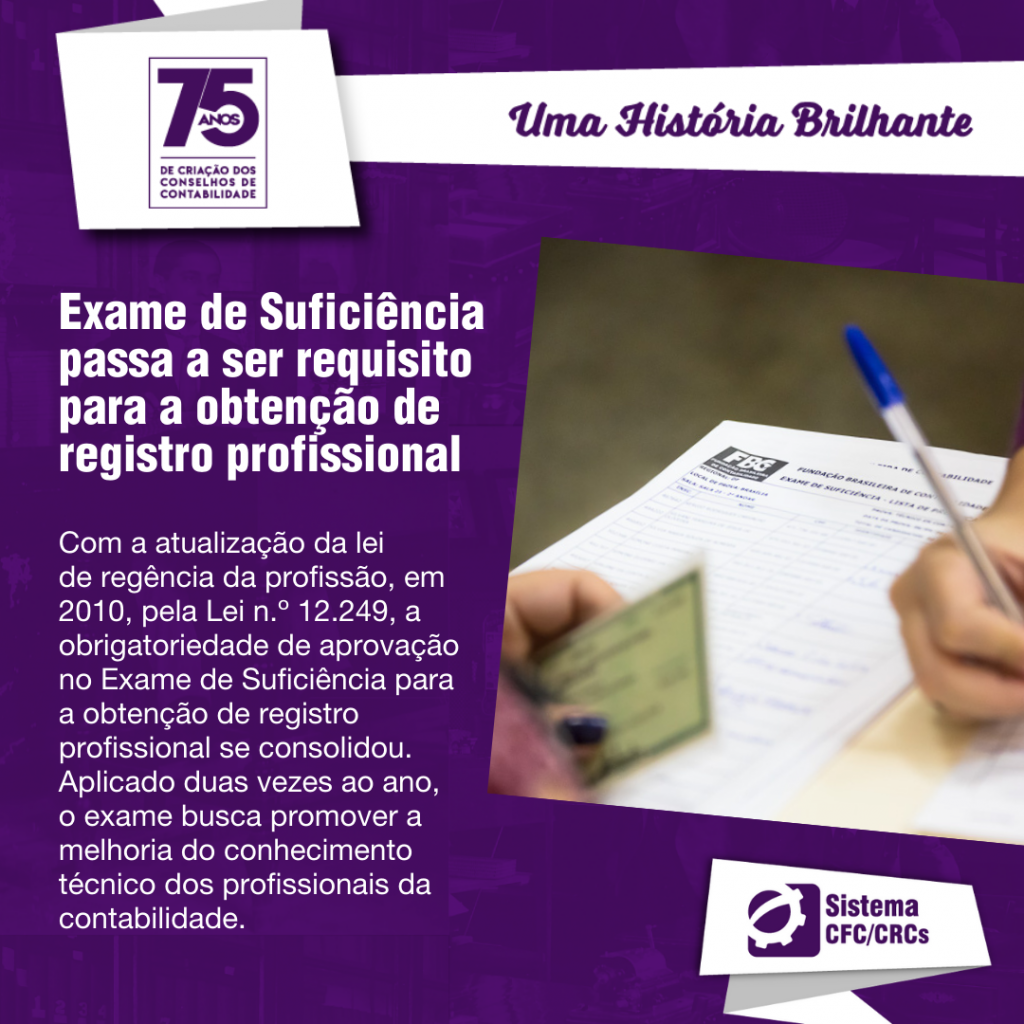Com a atualização da lei de regência da profissão, em 2010, pela Lei n.º 12.249, a obrigatoriedade de aprovação no Exame de Suficiência para obtenção de registro profissional se consolidou. Aplicado duas vezes ao ano, o exame busca promover a melhoria do conhecimento técnico dos profissionais da contabilidade.