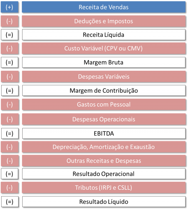O DRE possui uma estrutura simples e, assim como o Balanço Patrimonial, é necessário ter registros contábeis anuais ou mensais anteriores. A estrutura é a seguinte: