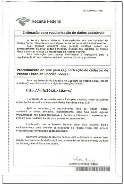 A Receita Federal alerta para golpe que está sendo realizado pelos Correios, e não por e-mail, como tem sido mais comum. O contribuinte recebe, por correspondência, em sua residência, uma intimação para regularização de dados cadastrais. Nesta correspondência, há um endereço eletrônico para acesso e atualização de dados bancários. O endereço informado não tem nenhuma relação com o site da Receita (veja modelo).