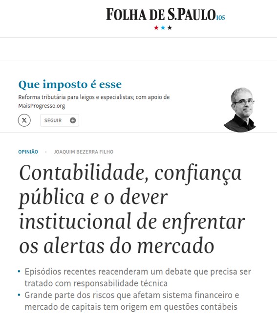 Jornal Folha de S.Paulo publica artigo do presidente do CFC, Joaquim Bezerra Filho, que aborda, sob perspectiva técnica e institucional, os recentes episódios envolvendo instituições financeiras e companhias abertas, e destaca a importância da contabilidade, da auditoria independente e dos mecanismos de governança para a preservação da confiança nos mercados. No texto, o presidente da autarquia defende o rigor na aplicação das normas, a atuação responsável dos agentes envolvidos e o fortalecimento das instituições como elementos essenciais para a estabilidade econômica e a credibilidade do sistema financeiro brasileiro.