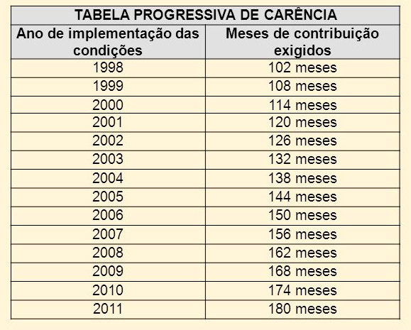Para usar a tabela, verifique o ano que você completou a idade mínima ou o tempo de contribuição necessários para o seu tipo de aposentadoria. A respectiva quantidade de meses é a carência exigida para a sua situação.