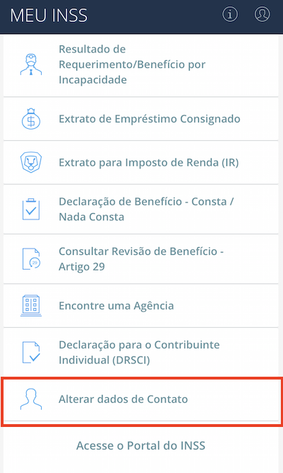 Passo 3: Na página inicial do aplicativo há vários serviços, como extrato previdenciário CNIS, calculadoras, agendamentos, extrato de pagamento de benefício, entre outros. Encontre um dos últimos itens da lista, chamado “Alterar dados de contato”.