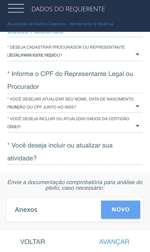 Para solicitar a atualização de dados cadastrais, relacionados aos vínculos empregatícios e salários, o cidadão precisa acessar a aba “Agendamentos/requerimentos”. Esse tipo de alteração, por sua vez, só será realizado pelo INSS quando o benefício previdenciário for requerido. Até o ano de 2016, esse tipo de atualização podia ser realizado a qualquer momento.
