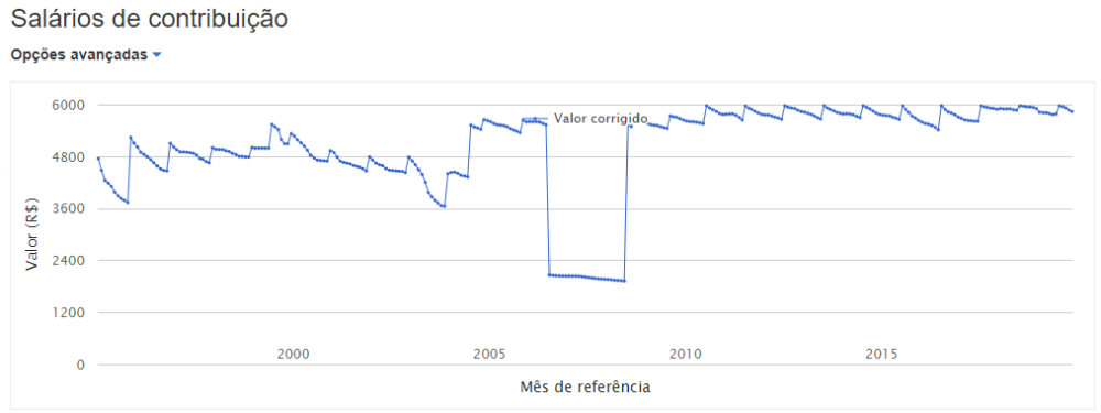 O Ricardo contribuiu quase sua vida toda no teto do INSS, mas em 2006 e 2007 ele trabalhou como autônomo e contribuiu perto do mínimo.