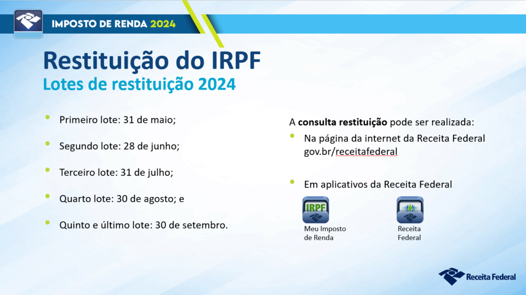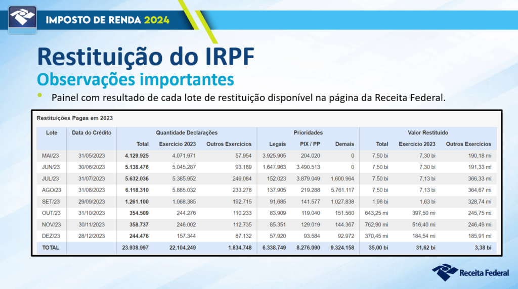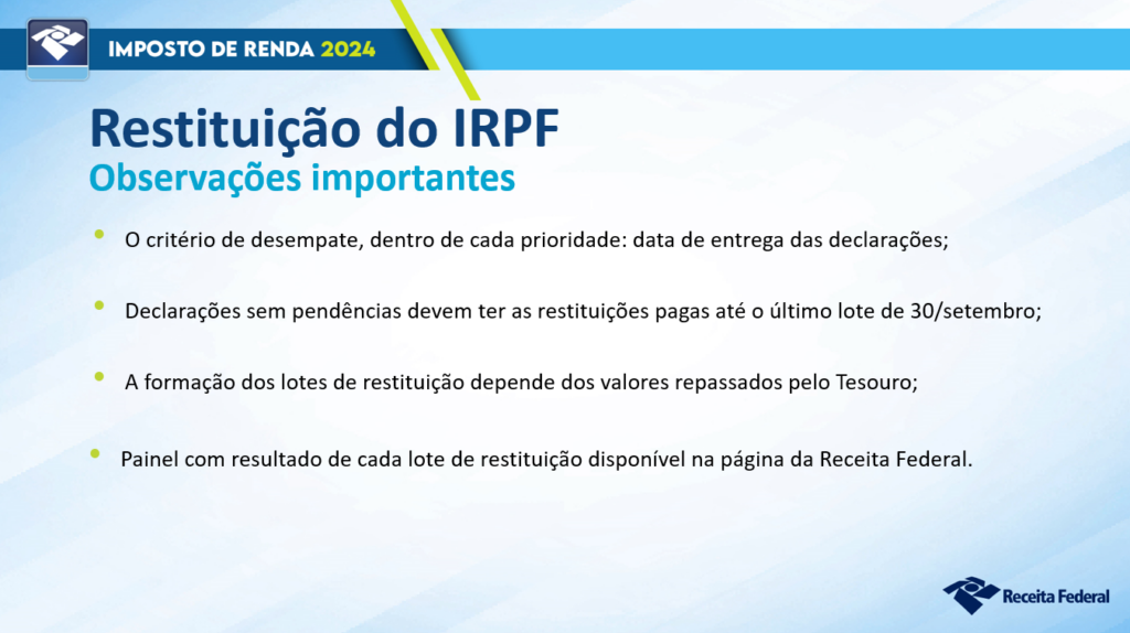 como uma forma de recuperar parte dos valores pagos ao longo do ano anterior. Para aqueles que têm direito à restituição, é importante acompanhar os lotes de pagamento divulgados pela Receita Federal após o processamento das declarações ainda de acordo com dados divulgados pela Receita no dia 12 de abril, 78,7% das declarações já entregues constam como restituir. Enquanto, 12,3% a pagar e 9,0% sem imposto. É importante lembrar que aqueles que precisam pagar para o leão podem realizar as destinações sociais como as direcionadas aos fundos em prol de crianças, adolescentes e idosos.