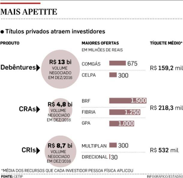Outros papéis. Com as incertezas no cenário político e a dificuldade em tomar crédito, a emissão de títulos corporativos foi a saída encontrada por empresas para financiar projetos. Assim, as emissões de CRI quase quadruplicaram, indo de R$ 2,3 bilhões, em 2015, para R$ 8,7 bilhões, em 2016. O estoque em dezembro passado era de R$ 73,6 bilhões.