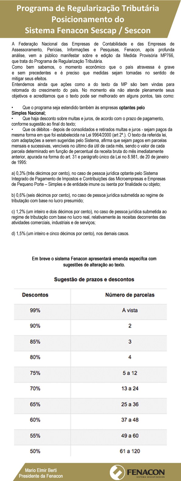 Fonte: Manifesto do Fenacon sobre a edição da MP766 que trata do programa de regularização tributária PRT