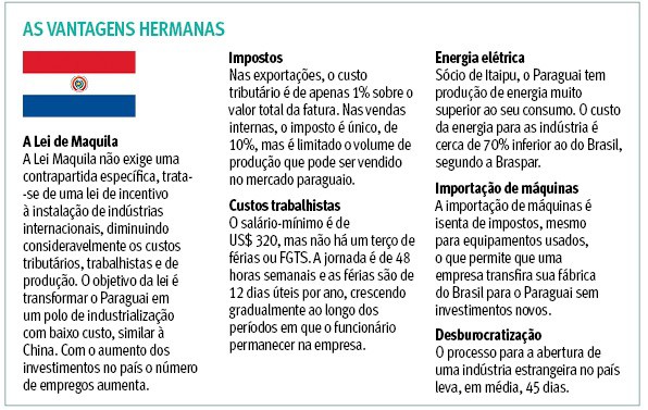 Energia barata, impostos reduzidos e menos encargos trabalhistas estão entre os sonhos de consumo de 10 entre 10 empresários brasileiros. E é isso que o Paraguai está oferecendo para indústrias que se estabelecem por lá. Traduzindo em números: o custo da energia é cerca de 70% mais barato do que no Brasil, exportações e importações de matérias-primas e equipamentos são isentas de qualquer taxa e os impostos e encargos sobre os salários oneram em apenas cerca de 30% a folha de pagamento (ante até 110% em solo brasileiro). O esforço deu resultados significativos nas exportações do país, que em 2016 atingiu recorde, sobretudo a partir de operações industrias instaladas recentemente, principalmente no entorno de Assunção, capital do país, e Cidade do Leste. As vendas internacionais crescem continuamente: nos últimos dois anos a alta foi de 25% com o faturamento atingindo US$ 313 milhões. Tudo isso graças ao conjunto de benefícios englobado na Lei de Maquila, que existe desde 1997 e ganhou força com a crise brasileira. Nos últimos três anos, cerca de 80 empresas do Brasil cruzaram a fronteira. O número de companhias gaúchas que passou para o outro lado ainda não é representativo, mas o governo de Horacio Cartes está de olho no Estado.