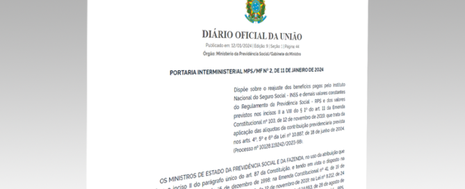 Foi publicada a Portaria Interministerial MPS/MF nº 2, de 11 de janeiro de 2024, do Ministério da Previdência Social e do Ministério da Fazenda, que divulga a tabela de faixas para atribuição de alíquotas previdenciárias, bem como limite de salários de contribuição ao INSS, além de reajustar os benefícios pagos pelo Instituto Nacional do Seguro [...]