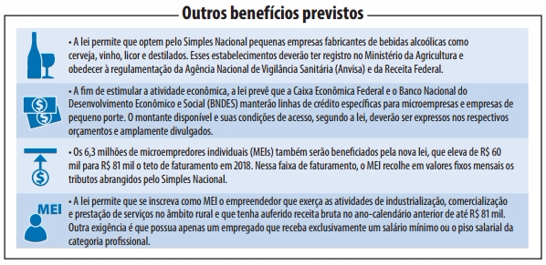 Além disso, a nova lei permite que 600 mil micros e pequenas empresas, que devem R$ 21 bilhões para a Receita Federal e estavam ameaçadas de exclusão do Simples nacional, continuem se beneficiando do regime simplificado de tributação. O prazo de parcelamento de dívidas tributárias sobe de 60 para 120 meses.