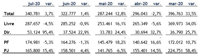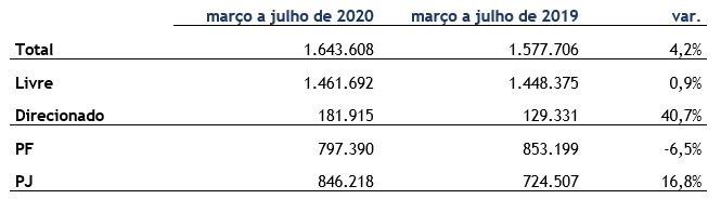 O quadro a seguir traz a evolução das concessões nos meses de março a julho de 2020, com base nas notas de crédito do BC, comparando com o mesmo período em 2019, quando o mercado de crédito já vinha em ritmo de crescimento, em especial no segmento livre.