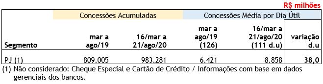 Na comparação entre março e agosto de 2019 com o período de 16 de março a 21 de agosto de 2020 (desde quando a OMS declarou a pandemia), utilizando dados gerenciais, houve alta significativa nas concessões para Pessoa Jurídica no segmento livre (PJ), de 38,0%, considerando a média por dia útil para cada período.