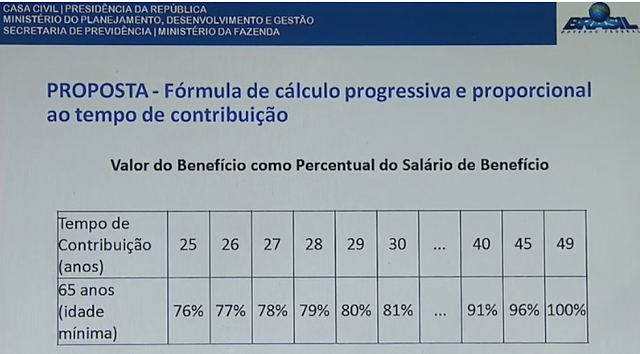Pelas simulações divulgadas pelo governo federal, se uma pessoa tem 65 anos, mas contribuiu somente por 25 anos, por exemplo, ela teria direito 76% do benefício. Com 26 anos de contribuição, o trabalhador passa a ter direito a 77% do valor do benefício e assim por diante até chegar aos 49 anos de contribuição – para ter direito a 100% do benefício.