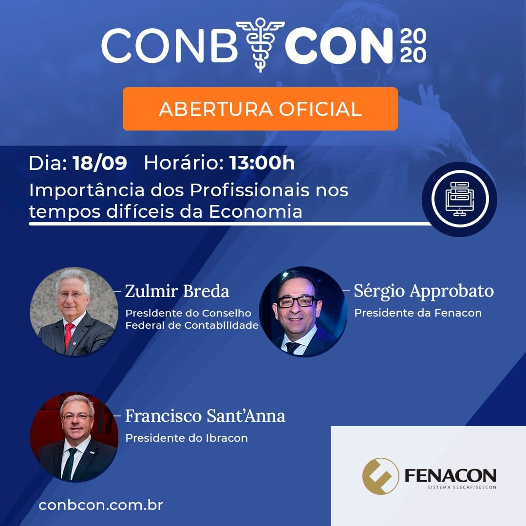 Nesta sexta (18/9), o presidente da Fenacon, Sérgio Approbato, participará da abertura oficial do Congresso Brasileiro de Contabilidade (Conbcon). O dirigente debaterá sobre o papel das Entidades nos tempos difíceis da COVID-19 e da Economia. Acompanhe!
