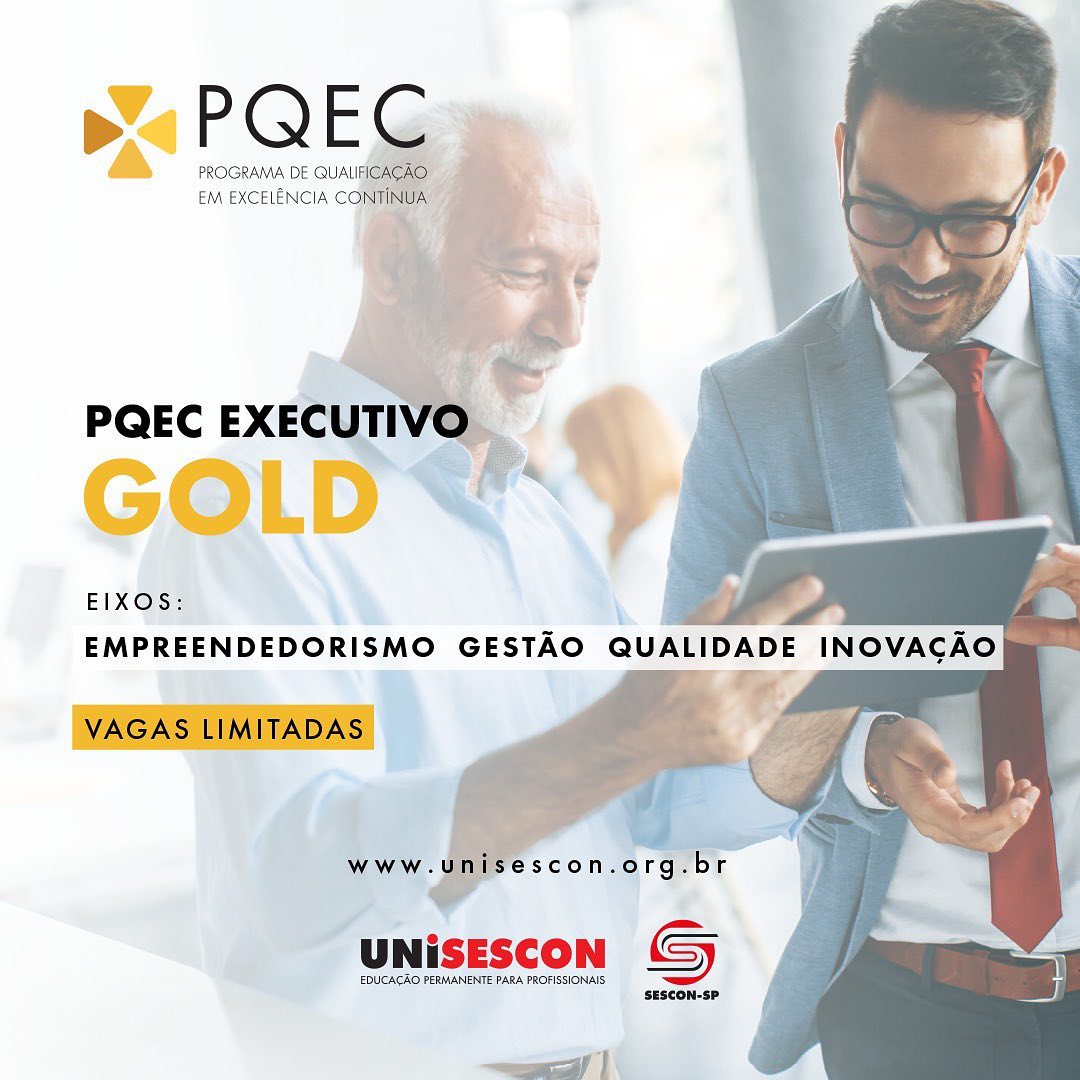 Faça parte do PQEC, o Programa de Qualificação em Excelência Continuada do Sescon-SP. Inscreva-se no PQEC Executivo Gold e invista no aperfeiçoamento da gestão, qualidade, empreendedorismo e inovação da sua empresa.