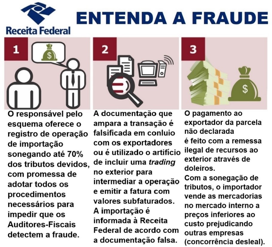 No decorrer dos trabalhos, os Auditores-Fiscais também detectaram a interposição fraudulenta de terceiros, com o uso de tradings no exterior e no Brasil utilizadas para figurar nas Declarações de Importação em substituição aos reais exportadores ou importadores. Foi identificada ainda a atuação de “consultores em comércio exterior” que possuem escritórios em países como China e EUA e promovem o contato entre importadores brasileiros e fornecedores no exterior já integrados ao esquema de subfaturamento, oferecendo um pacote completo de serviços, que incluía a identificação dos produtos na origem, a emissão da documentação com valores subfaturados, a execução dos procedimentos de exportação no exterior e de importação no Brasil e até a remessa irregular ao exterior do quantum omitido.