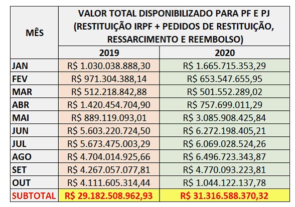 A Receita Federal pagou mais de R$ 31 bilhões em restituições, ressarcimentos e reembolsos, no período de janeiro a outubro de 2020. Esse valor significa um aumento de 7% em relação a igual período do ano passado, cujo valor foi de, aproximadamente, 29 bilhões de reais.