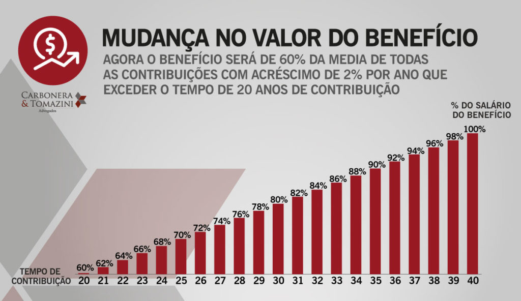 Quem tiver 24 anos de contribuição será 68% e assim por diante. Até chegar em 100% para aqueles que tiverem 40 anos de tempo de contribuição