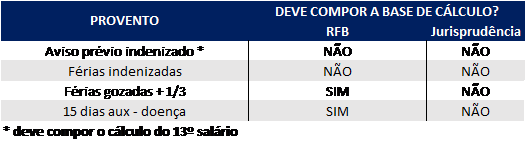 Além disso, a RFB entendeu ainda que os valores pagos ao trabalhador como, férias gozadas + 1/3 do salárioe os primeiros 15 dias de auxílio-doença, devem ser inclusos à base de cálculo das contribuições previdenciárias.