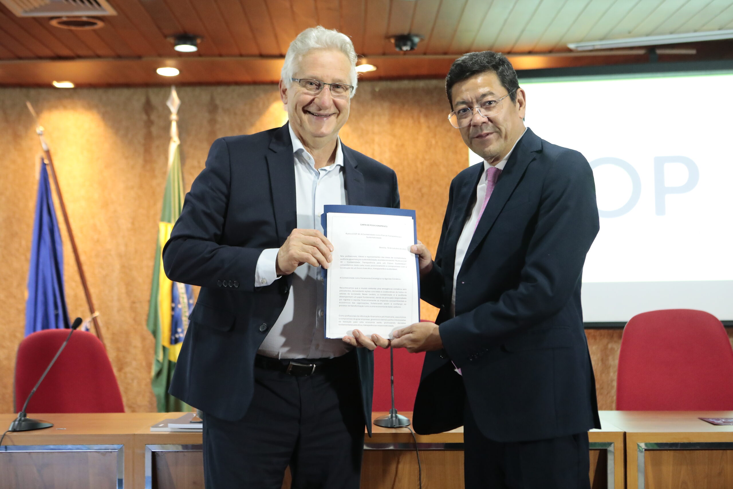 O evento Rumo à COP 30: A Contabilidade como Pilar de Transparência e Sustentabilidade trouxe um resultado para além da capacitação do público participante. Realizado no dia 14 de outubro, o encontro foi concluído com a divulgação de uma Carta de Posicionamento. O texto foi lido pelo ex-presidente do Conselho Federal de Contabilidade (CFC), Zulmir Breda, no encerramento do encontro. O documento estabelece o compromisso da classe contábil brasileira com a construção de um futuro mais ético, transparente e sustentável.