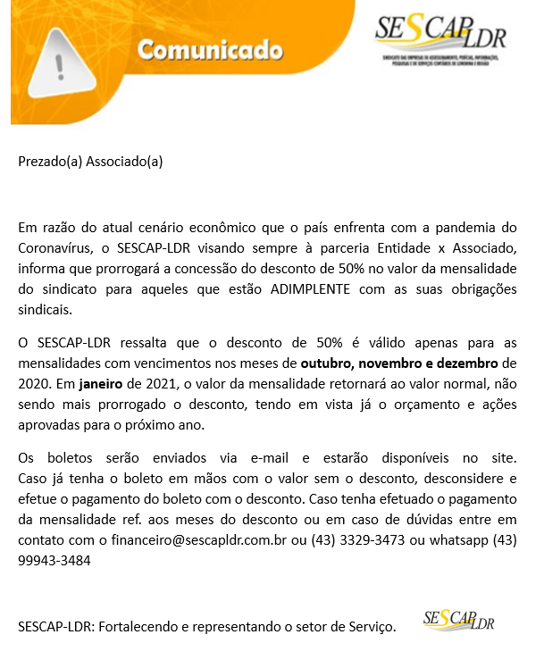Em razão do atual cenário econômico que o país enfrenta com a pandemia do Coronavírus, o SESCAP-LDR visando sempre à parceria Entidade x Associado, informa que prorrogará a concessão do desconto de 50% no valor da mensalidade do sindicato para aqueles que estão ADIMPLENTES com as suas obrigações sindicais.