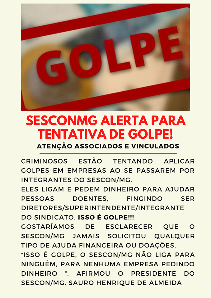 O Sescon/MG faz um alerta a todos os associados e vinculados sobre criminosos que estão tentando aplicar golpes em empresas ao se passarem por integrantes do sindicato no estado de Minas Gerais. Eles ligam e pedem dinheiro para ajudar pessoas doentes, fingindo ser diretores/superintendente/ integrante do sindicato. Isso é golpe!!!