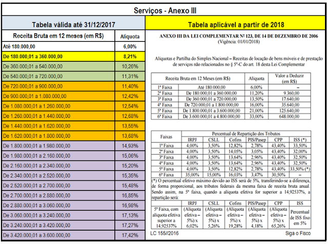 Com a publicação da Lei Complementar nº 155/2016, que alterou as regras e limites do Simples Nacional de que trata a Lei Complementar nº 123/2006, surgiu novas tabelas.