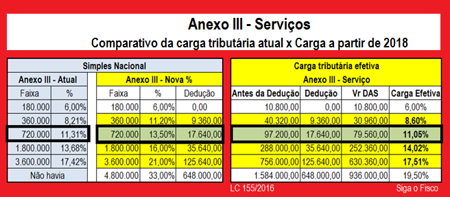 Nova tabela do Simples Nacional, instituída pela Lei Complementar nº 155/2016, aplicável ao aos serviços enquadrados no Anexo III da Lei Complementar nº 123/2006 (§ 5º-B do art. 18) promete aumentar a carga tributária de três das seis faixas de faturamento.