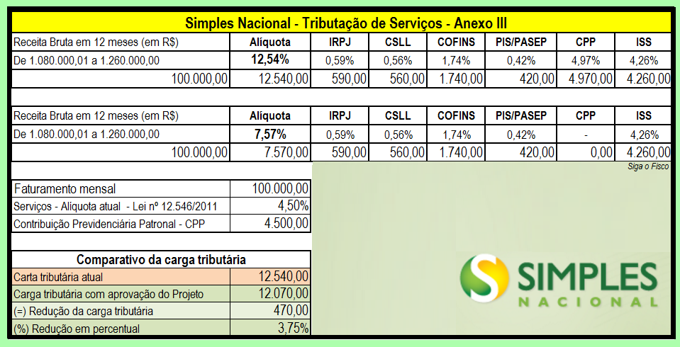 A empresa deixa de recolher no Documento de Arrecadação do Simples – DAS o percentual destinado a CPP, neste exemplo representa 4,97% e passa a pagar a Contribuição Previdenciária Patronal em guia própria, com alíquota fixa, que atualmente é 4,5% (Lei nº 12,546/2011).